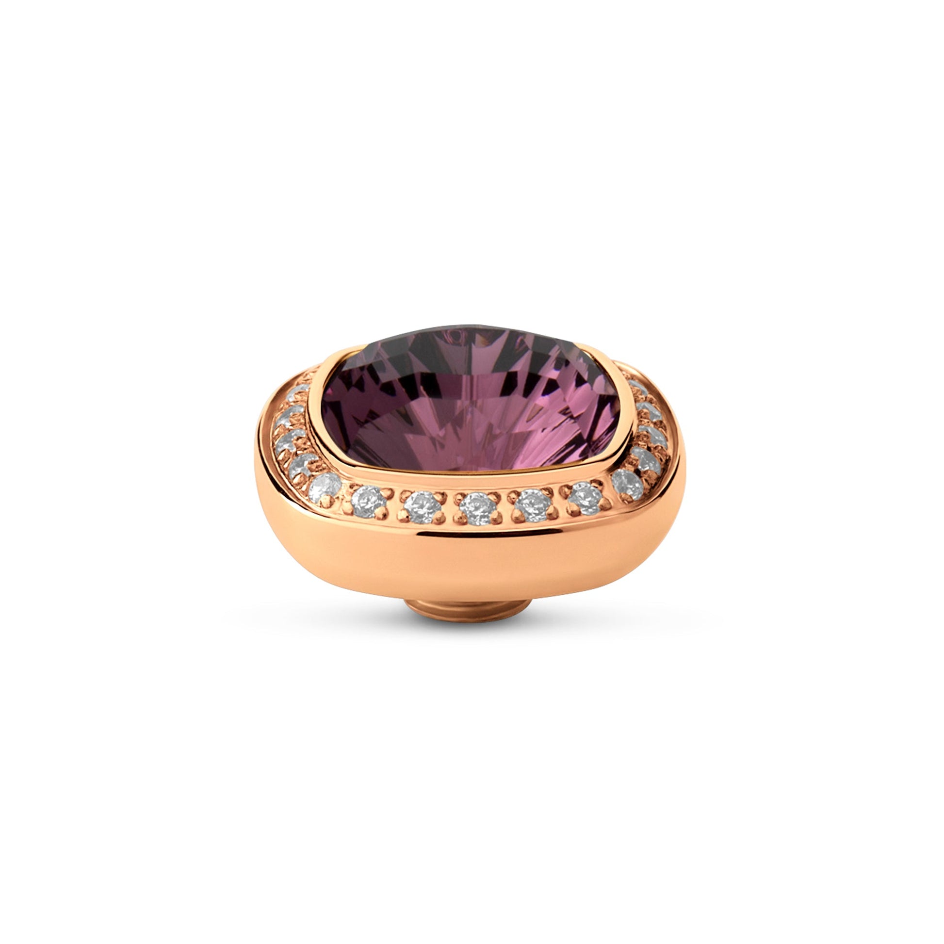 A pedra Melano Vivid Deluxe tem um núcleo de zircônia colorida e uma moldura de pedras cristalinas refinadas. Devido à forma ligeiramente quadrada e ao corte facetado, a pedra exala luxo. A pedra Deluxe tem um diâmetro de 12 mm e está disponível em revestimento prateado, ouro rosa ou dourado.